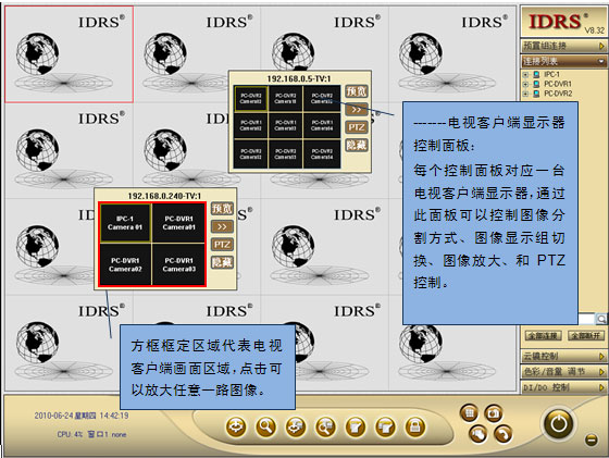 IDRS-PC Server、NVR客戶端或IDRS-NVMS集中監控管理系統中的中心管理服務器、流媒體服務器和集中管理客戶端都可以作為主控設備來控制電視客戶端,一臺主控設備可以同時控制多臺電視客戶端,但所有電視客戶端的顯示器總數不能超過24臺(即一臺主控設備最多能控制由24臺顯示器組建的顯示器墻)。